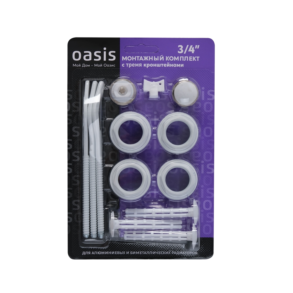 Универсальные монтажные комплекты Oasis на 13 элементов созданы для надежного крепежа радиаторов отопления. В состав набора входит все необходимое для установки отопительного прибора и его соединения с трубами диаметром 3/4".
