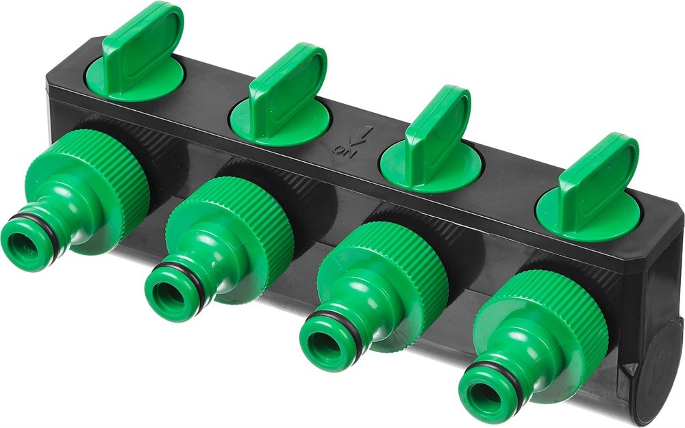 Применяется для одновременного подключения четырех водозаборных линий к водопроводной трубе или крану с внешней резьбой 3/4″.