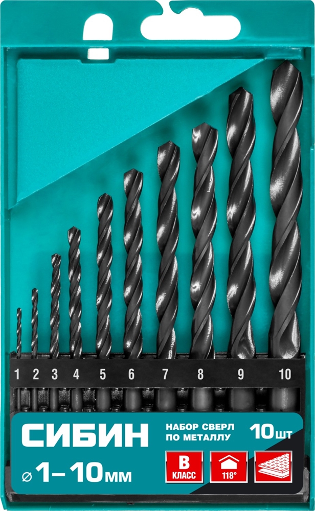 СИБИН 10 шт, (1-10 мм), быстрорежущая сталь, класс В, набор сверл по металлу (29610-H10)