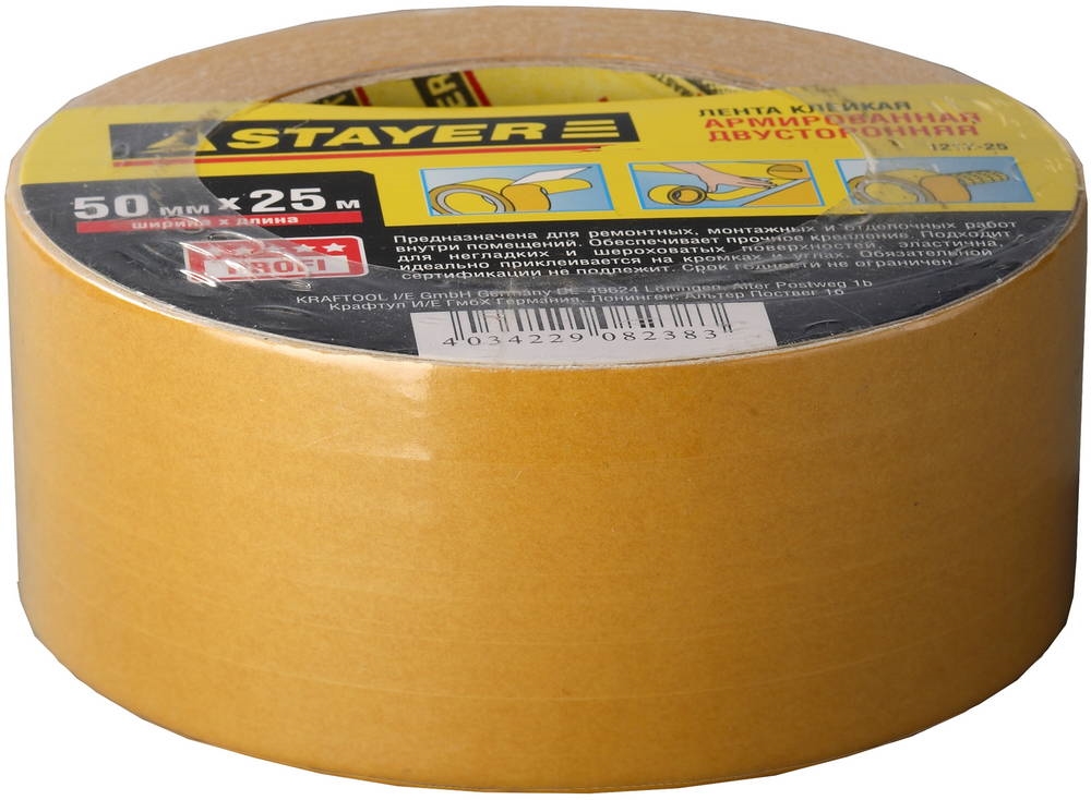 STAYER 50 мм, 25 м, на тканевой основе, двухсторонняя клейкая лента, Professional (1217-25) сертифицирован производителем Stayer, передача сертификатов осуществляется в момент отгрузки товара после обращения покупателя.