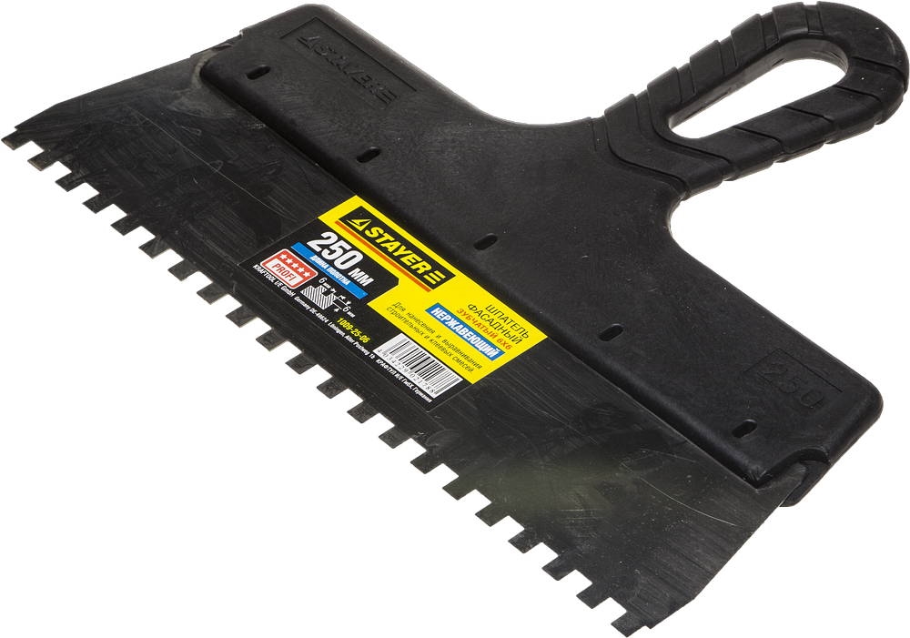 STAYER PROFlat, 250 мм, зуб 6 х 6 мм, пластиковая ручка, зубчатый, нержавеющий, фасадный шпатель, Professional (1009-25-06) сертифицирован производителем Stayer, передача сертификатов осуществляется в момент отгрузки товара после обращения покупателя.