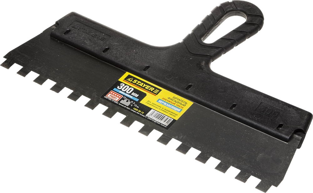 STAYER PROFlat, 300 мм, зуб 10 х 10 мм, пластиковая ручка, зубчатый, нержавеющий, фасадный шпатель, Professional (1009-30-10) сертифицирован производителем Stayer, передача сертификатов осуществляется в момент отгрузки товара после обращения покупателя.