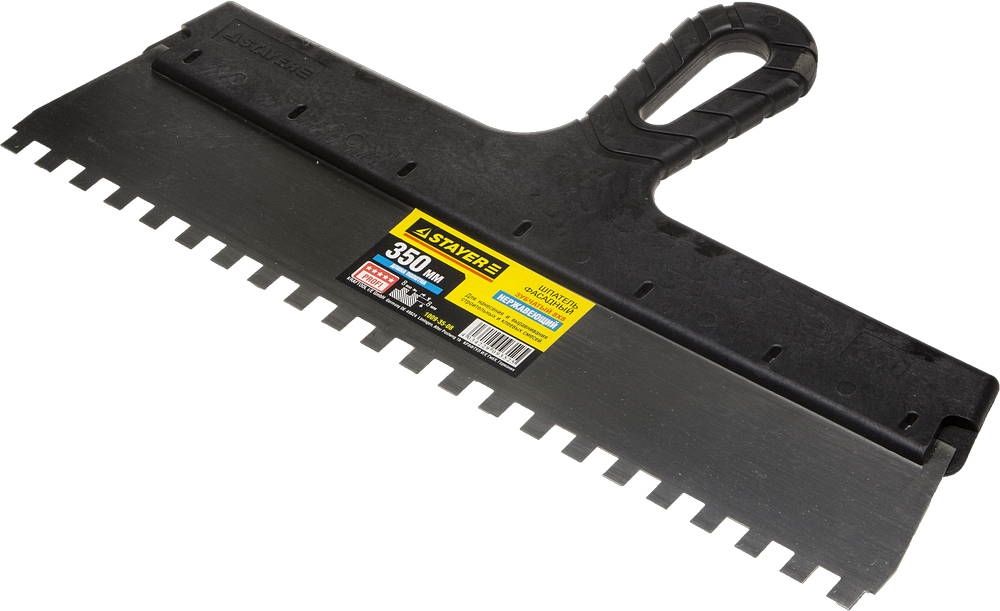 STAYER PROFlat, 350 мм, зуб 8 х 8 мм, пластиковая ручка, зубчатый, нержавеющий, фасадный шпатель, Professional (1009-35-08) сертифицирован производителем Stayer, передача сертификатов осуществляется в момент отгрузки товара после обращения покупателя.