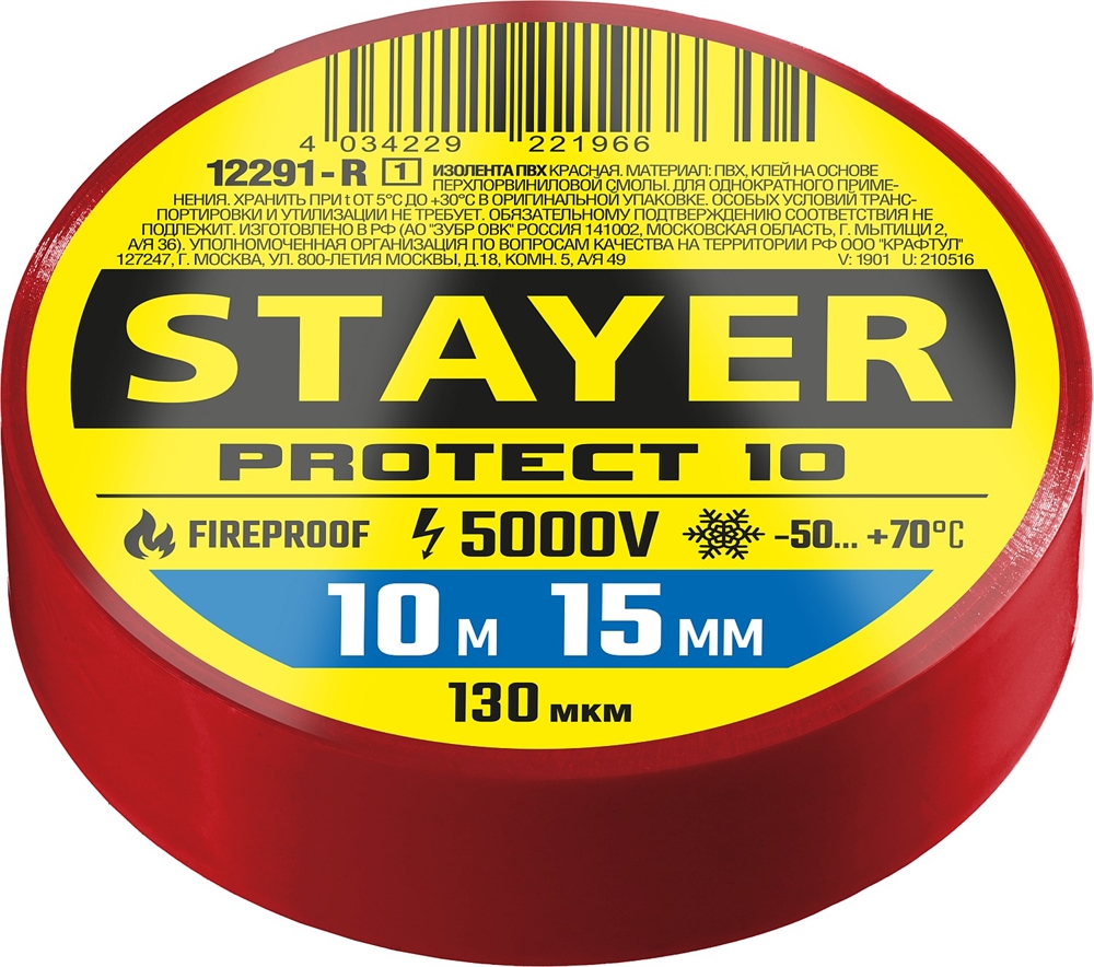 STAYER PROTECT-10, 15 мм х 10 м, 5 000 В, красная, изолента ПВХ, Professional (12292-R) сертифицирован производителем Stayer, передача сертификатов осуществляется в момент отгрузки товара после обращения покупателя.