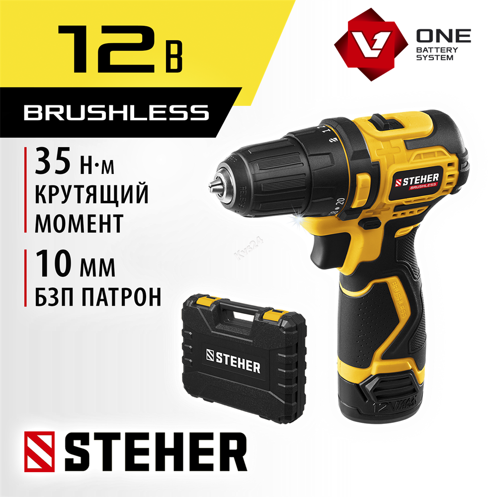 STEHER 12 В, 35 Н·м, 1 АКБ (2 А·ч), бесщеточная дрель-шуруповерт, кейс (CDB-120-1) сертифицирован производителем STEHER, передача сертификатов осуществляется в момент отгрузки товара после обращения покупателя.
