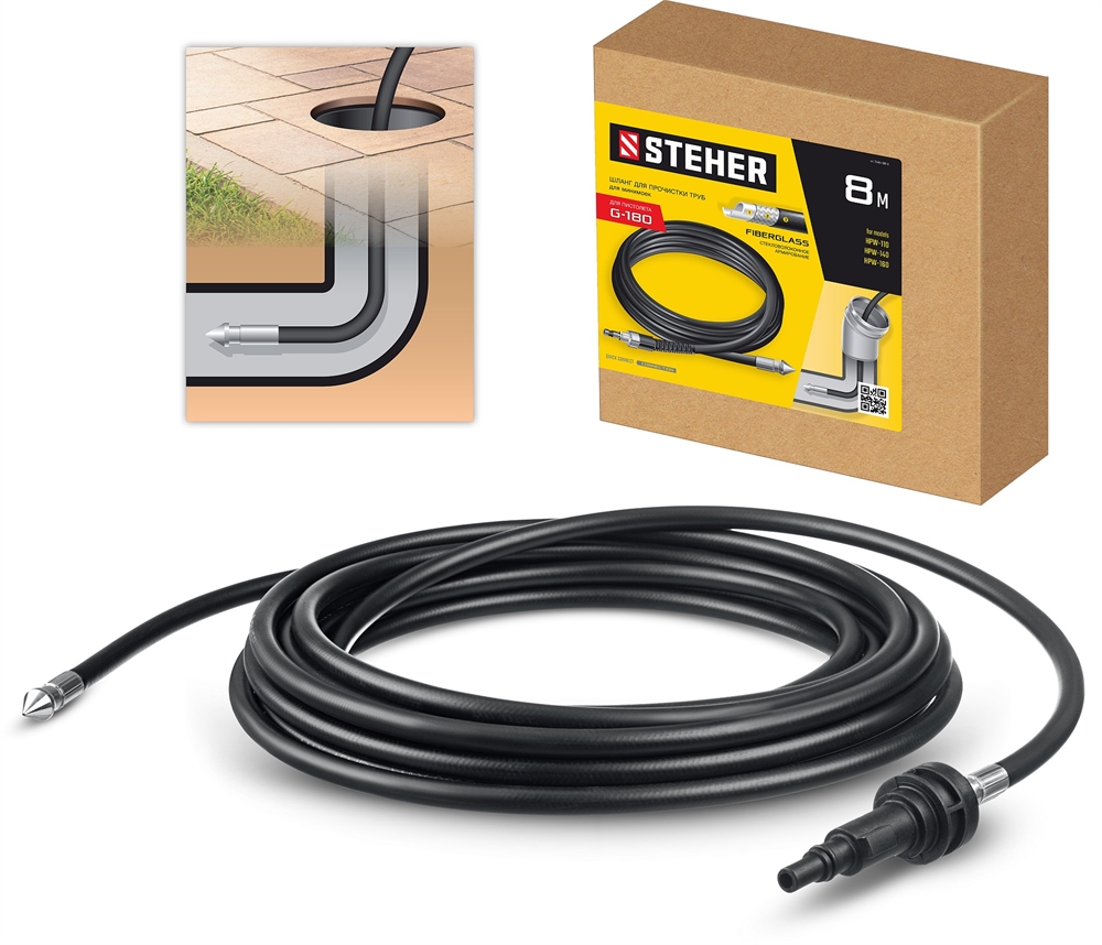 STEHER для пистолета G-180, 8 м, шланг для прочистки труб (75414-180-8) сертифицирован производителем STEHER, передача сертификатов осуществляется в момент отгрузки товара после обращения покупателя.