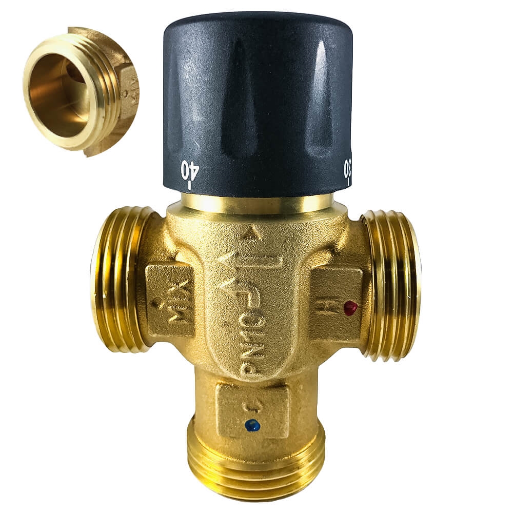 Смесительный термостатический клапан имеет два входных штуцера для подвода смешиваемых сред и один выходной (боковой). В клапан встроен перенастраиваемый термостатический элемент, поддерживающий в зависимости температуру теплоносителя в диапазонах 20 – 55 °С.