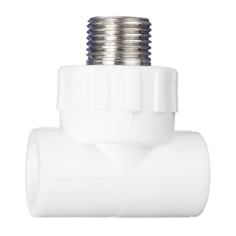 Трехсторонний полипропиленовый фитинг для присоединения к полипропиленовому трубопроводу компонента инженерной системы с резьбовым подключением. Резьба фитинга - наружная трубная.
