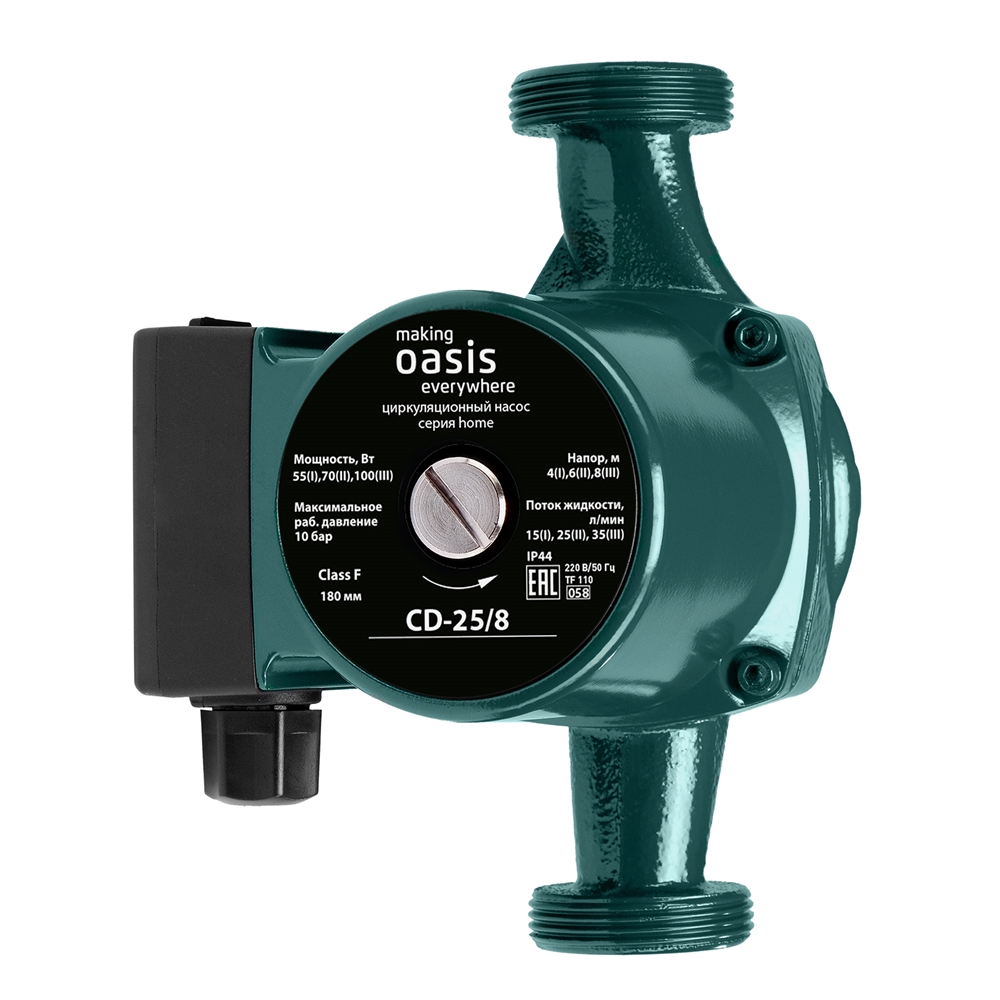 Циркуляционный насос making Oasis everywhere серии Home обеспечивает циркуляцию воды в системах отопления, а также системах обогрева полов. Прибор уже укомплектован кабелем длиной 1 метр с евровилкой, имеет небольшие габаритные размеры и вес, работает практически бесшумно и потребляет мало электроэнергии. Циркуляционные насосы making Oasis everywhere серии Home применяют в загородных домах площадью свыше 100 м², так как естественная конвекция не сможет обеспечить равномерный прогрев всех отопительных приборов.