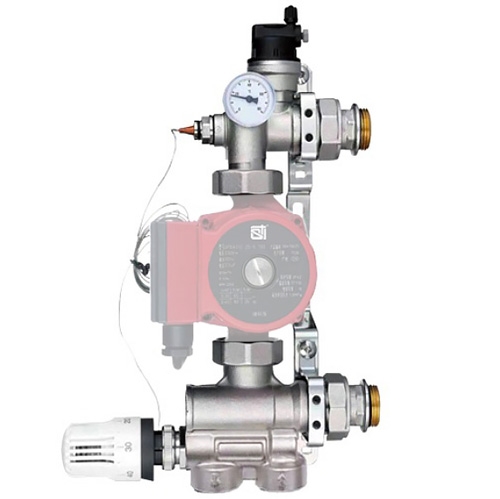 Насосно-смесительный узел Е008-3 предназначен для создания в системе отопления здания открытого циркуляционного контура с пониженной температурой теплоносителя. Монтируется на коллекторной группе низкотемпературного контура. Подключается к высокотемпературному контуру системы отопления.