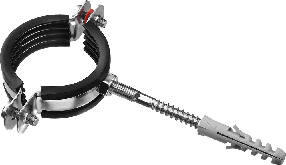 - Комплектность набора позволяет крепить хомут как с помощью гайки, так и с использованием шпильки и дюбеля