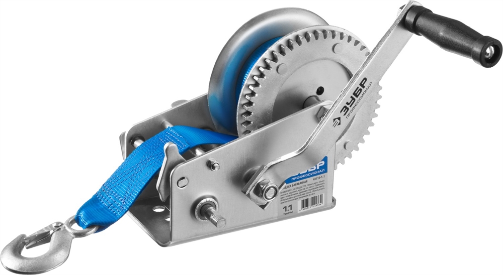 ЗУБР 1.1 т, 10 м, ручная барабанная тяговая ленточная лебедка, Профессионал (43115-1.1)