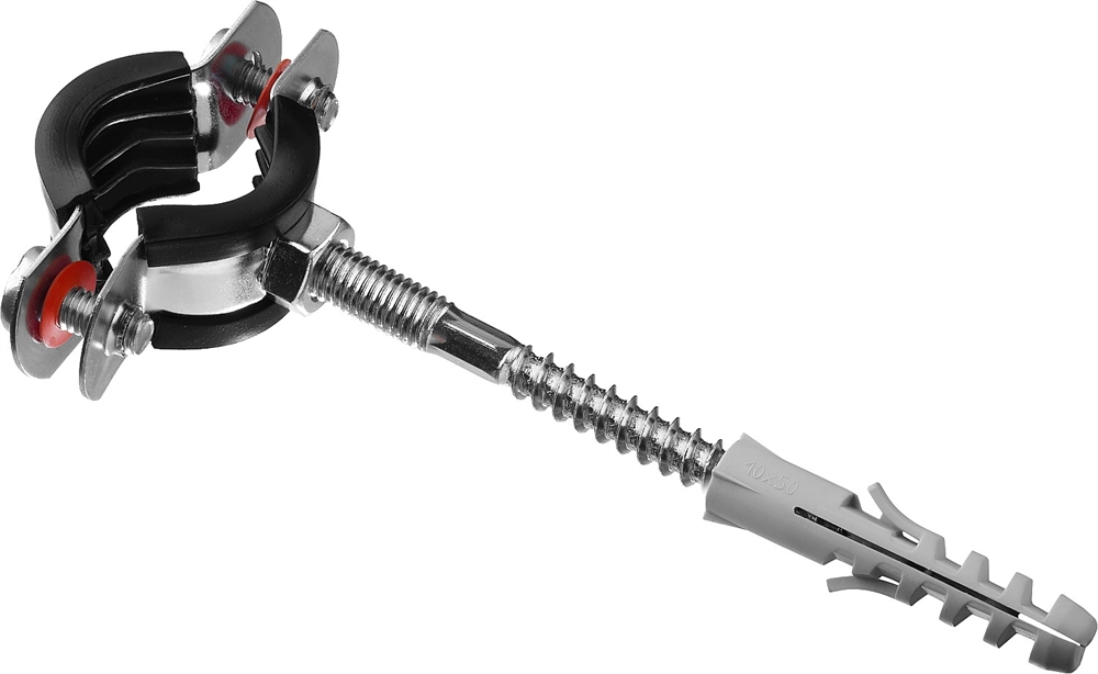 - Комплектность набора позволяет крепить хомут как с помощью гайки, так и с использованием шпильки и дюбеля