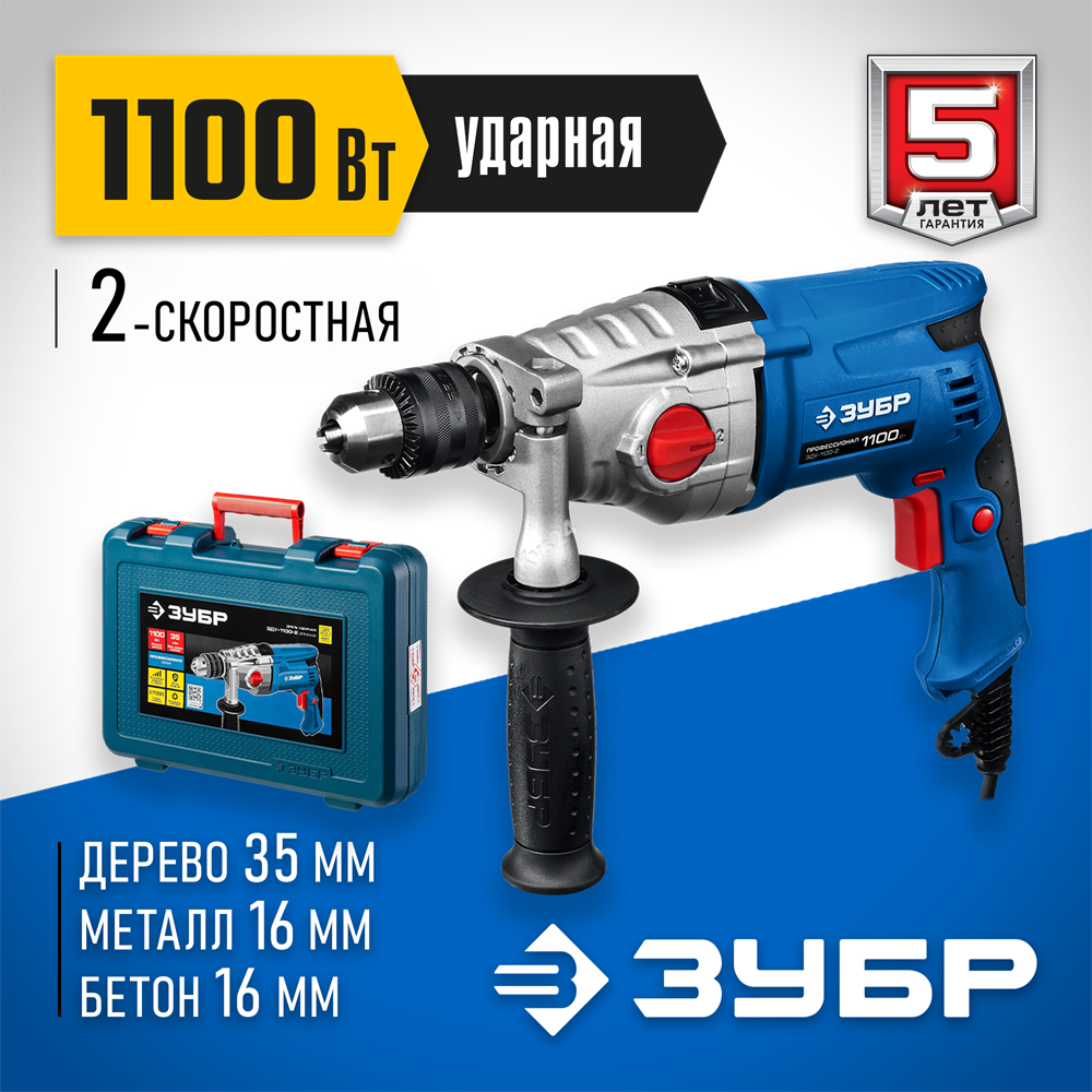 ЗУБР 1100 Вт, 13 мм, 2 скорости, ударная дрель, мет. корпус, кейс, Профессионал (ЗДУ-1100 ЭРМКМ2)
