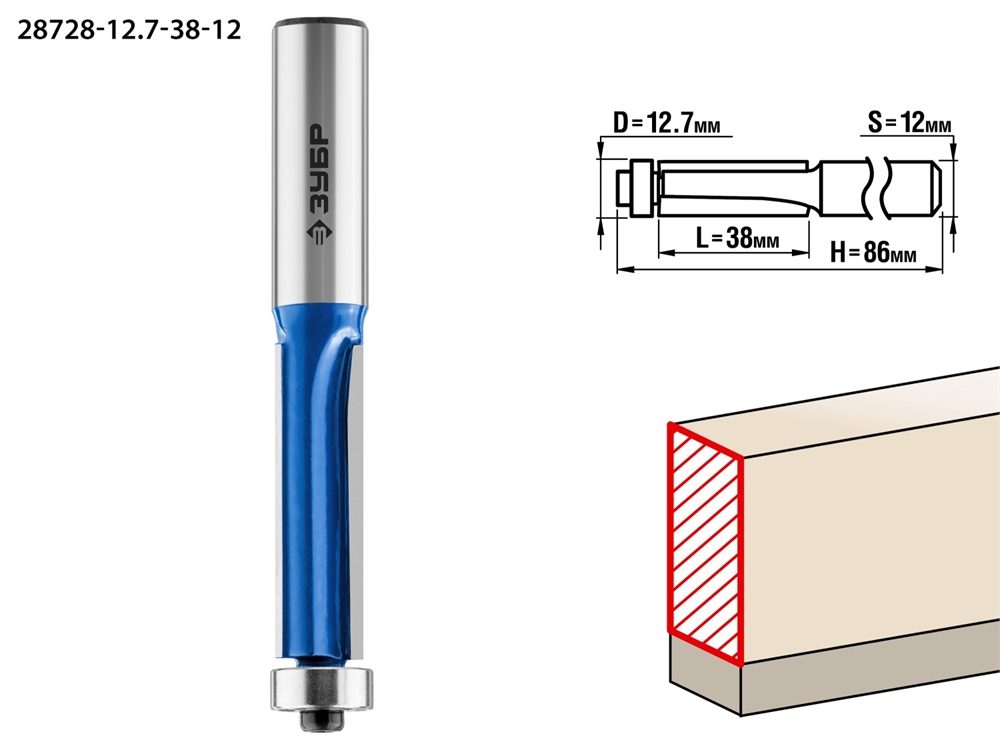 ЗУБР 12.7 x 38 мм, хвостовик 12 мм, фреза кромочная с нижним подшипником (3 лезвия), Профессионал (28728-12.7-38-12)
