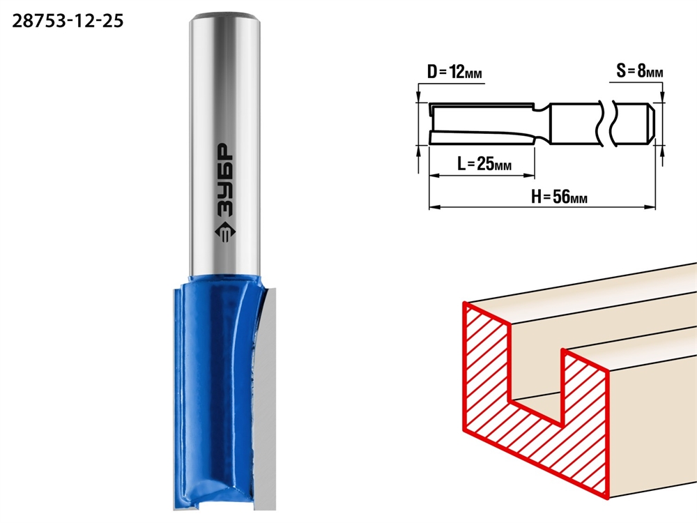 ЗУБР 12 x 25 мм, хвостовик 8 мм, фреза пазовая прямая, Профессионал (28753-12-25)
