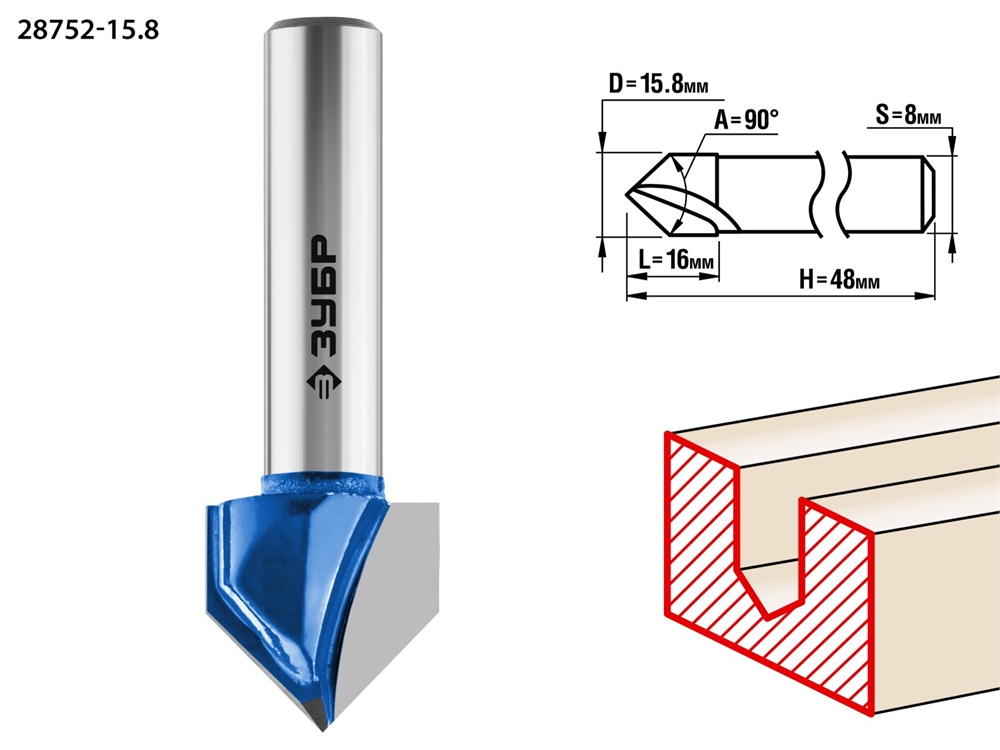 ЗУБР 15.8 x 16 мм, угол 90° мм, фреза пазовая галтельная V-образная, Профессионал (28752-15.8)