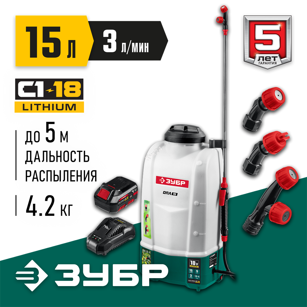 ЗУБР 15 л, 1 АКБ 4 А·ч, аккумуляторный опрыскиватель (ОПЛ-15-41)
