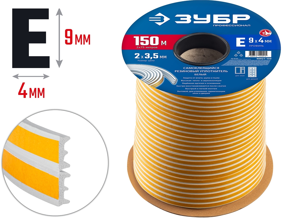 ЗУБР 150 м, E-профиль, размер 9 х 4 мм, белый, самоклеящийся резиновый уплотнитель, Профессионал (40921-150) сертифицирован производителем ЗУБР, передача сертификатов осуществляется в момент отгрузки товара после обращения покупателя.