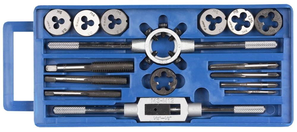 Набор предназначен для резьбонарезных работ в конструкциях и заготовках из сталей и цветных металлов. Метчики ручные однопроходные используются для нарезания внутренней метрической резьбы с нормальным шагом в глухих и сквозных отверстиях. Плашки предназначены для нарезания внешней метрической резьбы с нормальным шагом. Метчикодержатель предназначен для надежного закрепления метчиков Плашкодержатель используется для закрепления плашек при проведении резьбонарезных работ