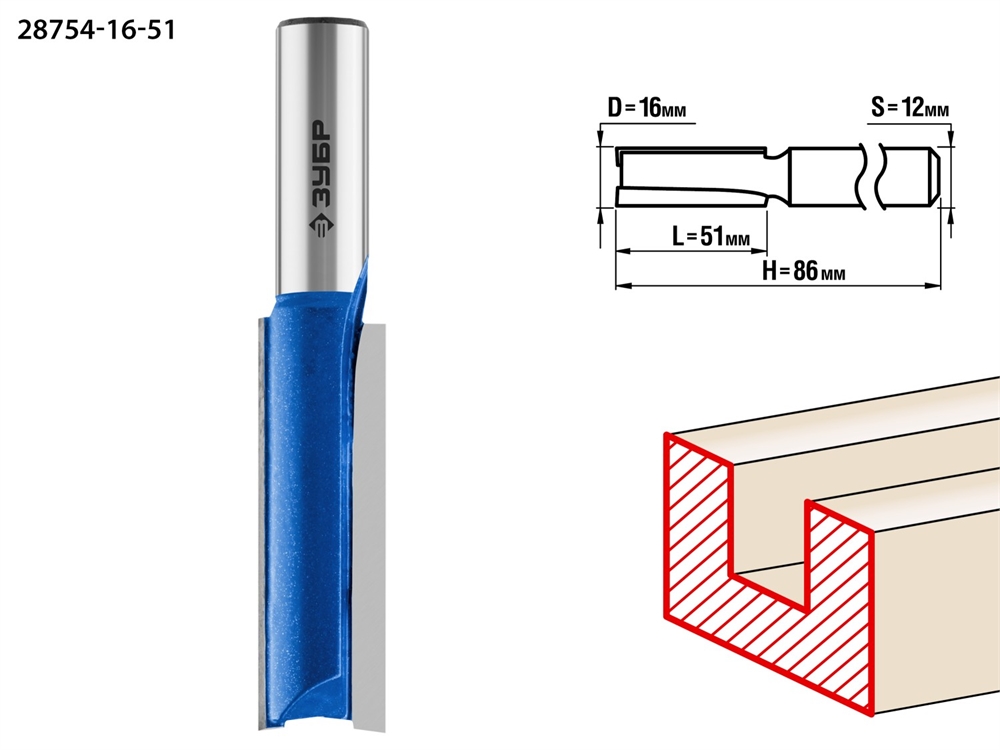 ЗУБР 16 x 51 мм, хвостовик 12 мм, фреза пазовая прямая. удлиненная, Профессионал (28754-16-51)