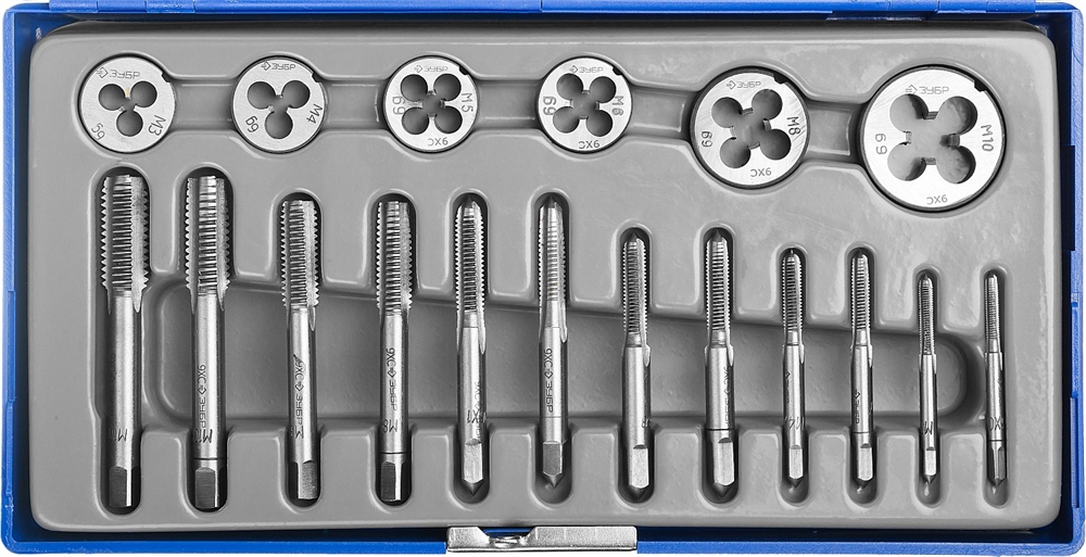 ЗУБР 18 предм., сталь 9ХС, набор метчиков и плашек в пластиковом боксе (28120-H18)