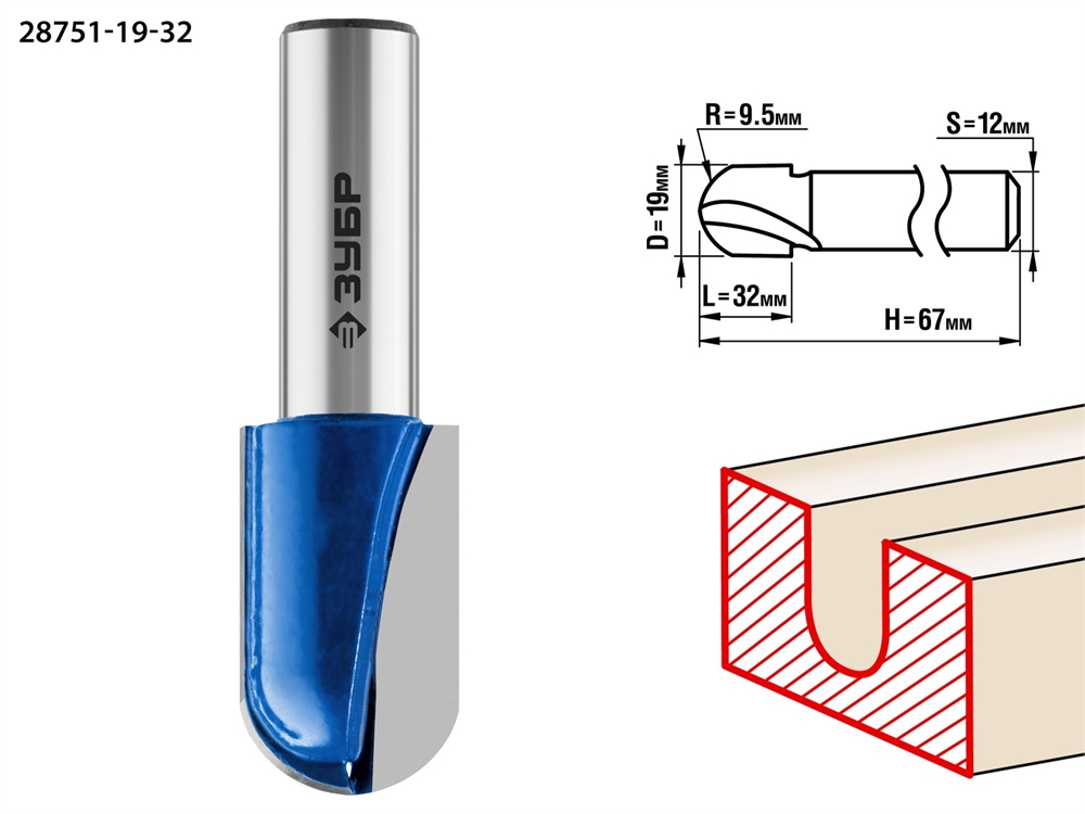 ЗУБР 19 x 32 мм, радиус 12.7 мм, фреза пазовая галтельная, Профессионал (28751-19-32)