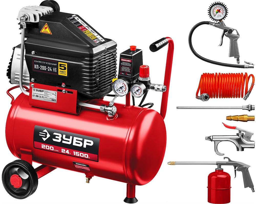 ЗУБР 200 л/мин, 24 л, 1500 Вт, 6 предметов, безмасляный компрессор (КП-200-24 Н6)