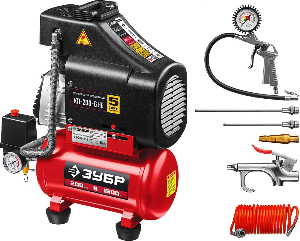 ЗУБР 200 л/мин, 6 л, 1500 Вт, 6 предметов, безмасляный компрессор (КП-200-6 Н6)