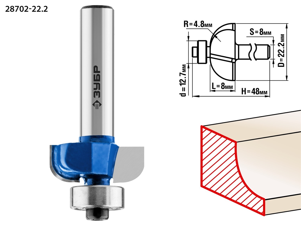 ЗУБР 22.2 x 8 мм, радиус 4.8 мм, фреза кромочная калевочная №2, Профессионал (28702-22.2)