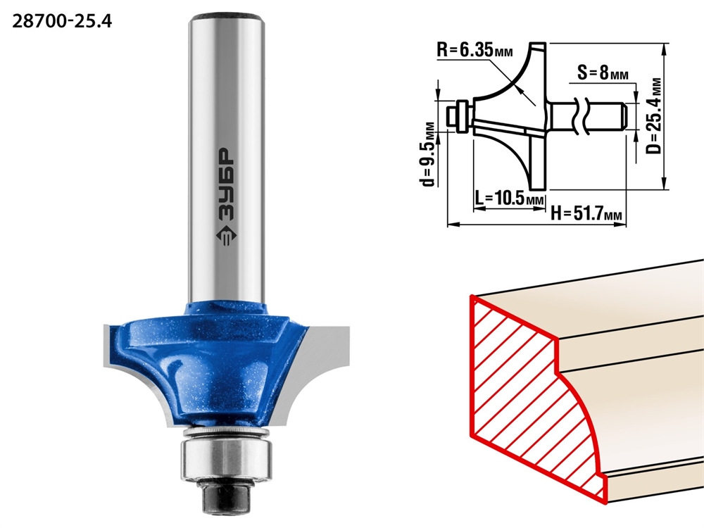 ЗУБР 25.4 x 10.5 мм, радиус 6.3 мм, фреза кромочная калевочная №1, Профессионал (28700-25.4)