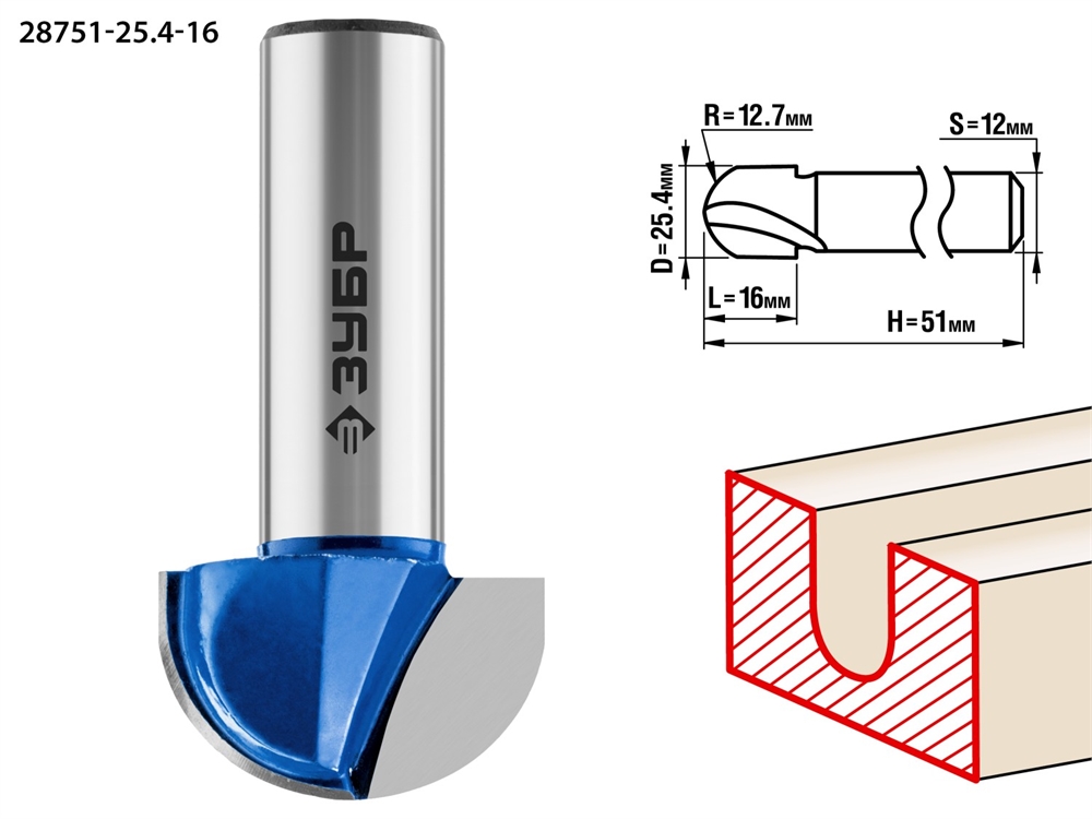 ЗУБР 25.4 x 16 мм, радиус 9.5 мм, фреза пазовая галтельная, Профессионал (28751-25.4-16)