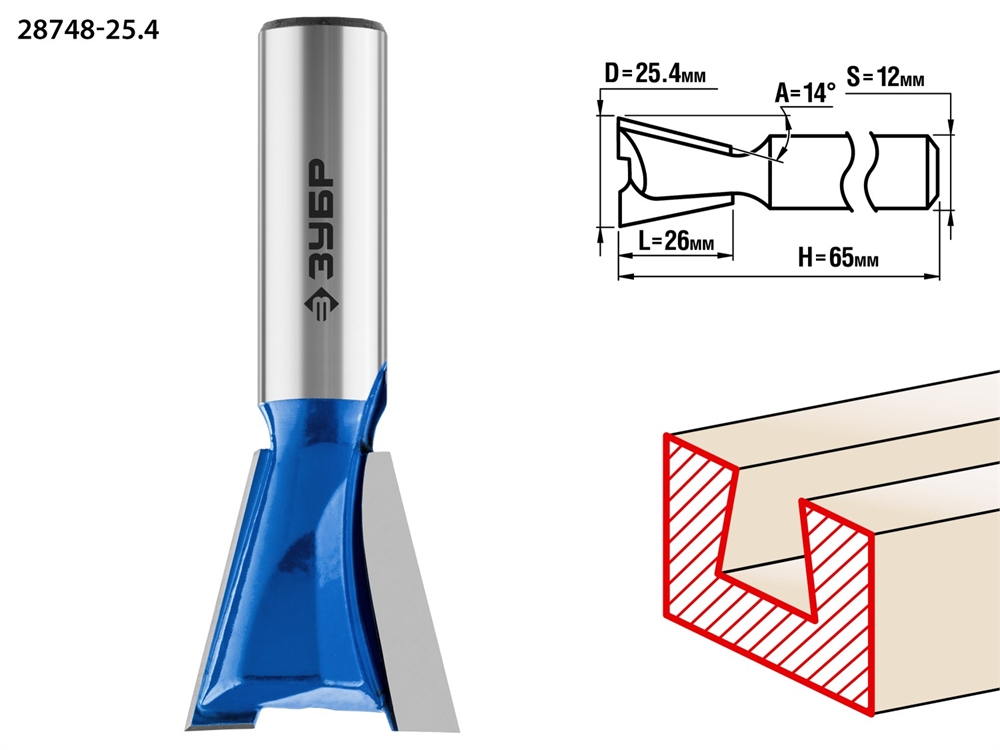ЗУБР 25.4 x 26 мм, угол 14°, фреза пазовая фасонная ″Ласточкин Хвост″, Профессионал (28748-25.4)
