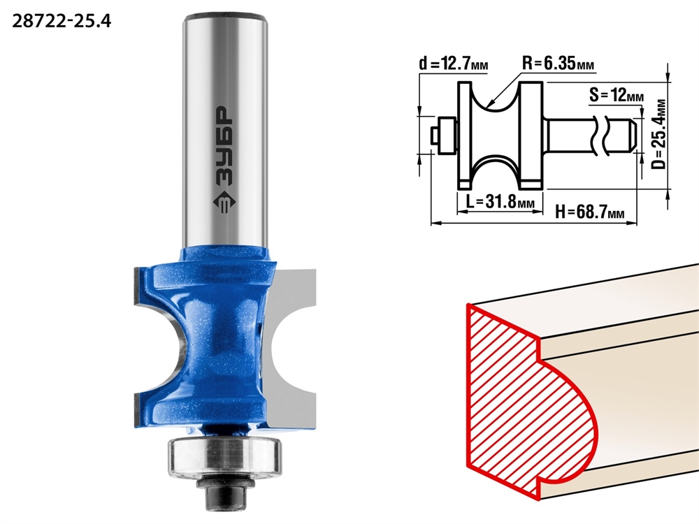 ЗУБР 25.4 x 31.8 мм, радиус 6.3 мм, фреза полустержневая с подшипником, Профессионал (28722-25.4)