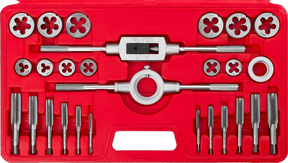 Набор предназначен для резьбонарезных работ в конструкциях и заготовках из сталей и цветных металлов. Метчики ручные однопроходные используются для нарезания внутренней метрической резьбы с нормальным шагом в глухих и сквозных отверстиях. Плашки предназначены для нарезания внешней метрической резьбы с нормальным шагом. Метчикодержатель предназначен для надежного закрепления метчиков Плашкодержатель используется для закрепления плашек при проведении резьбонарезных работ