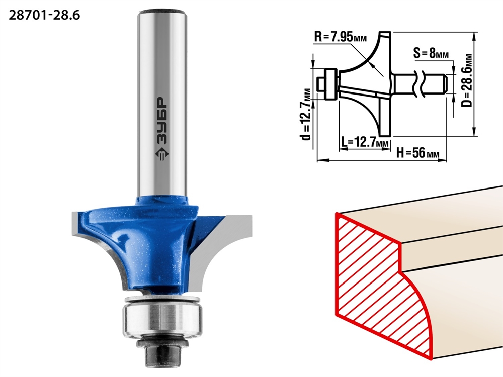 ЗУБР 28.6 x 12.7 мм, радиус 8 мм, фреза кромочная калевочная №1, Профессионал (28701-28.6)