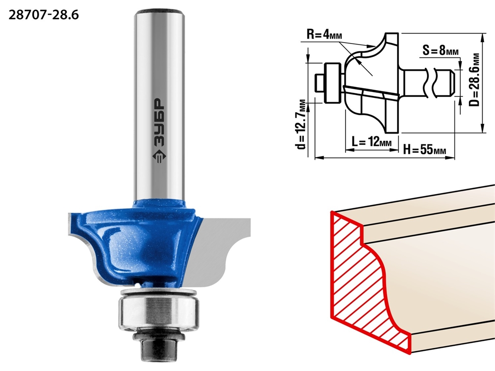 ЗУБР 28.6 x 12 мм, радиус 4 мм, фреза кромочная калевочная №6, Профессионал (28707-28.6)