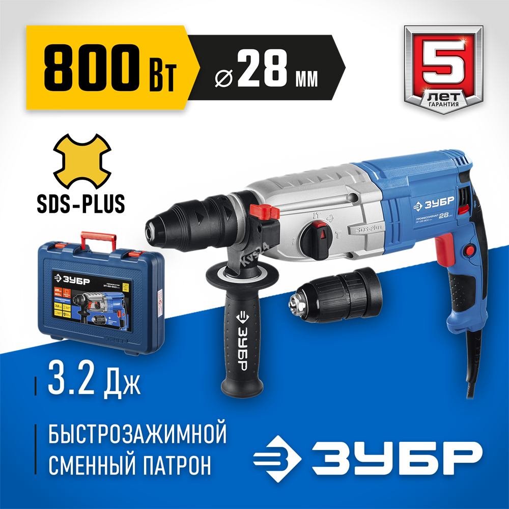 ЗУБР 28 мм, 800 Вт, перфоратор SDS Plus + БЗП, Профессионал (ЗП-28-800 КМ)