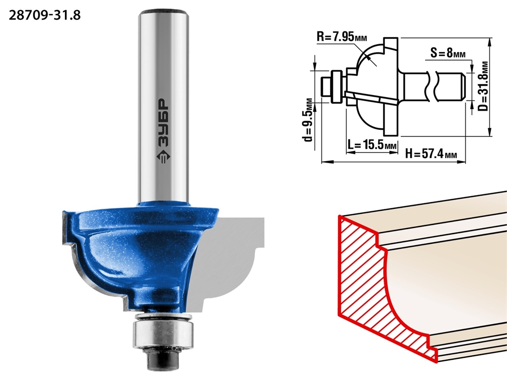 ЗУБР 31.8 x 17 мм, радиус 8 мм, фреза кромочная калевочная №7, Профессионал (28709-31.8)