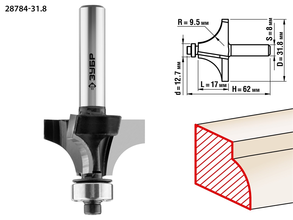 ЗУБР 31.8 x 17 мм, радиус 9.5 мм, фреза кромочная калевочная №1, Профессионал (28784-31.8)