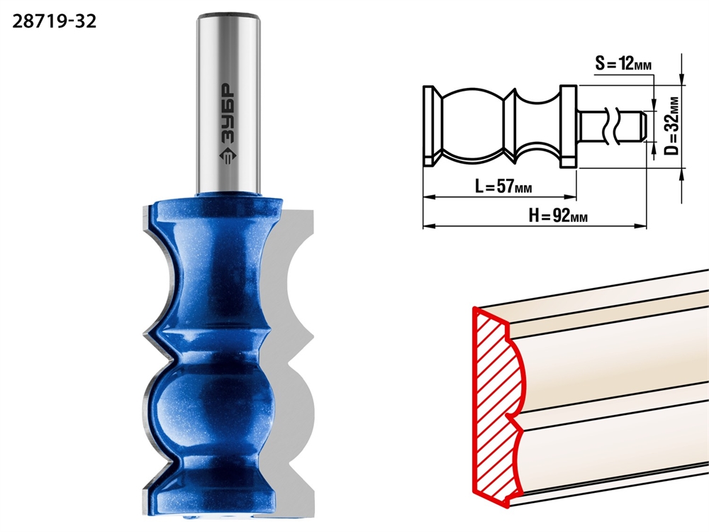 ЗУБР 32 x 57 мм, хвостовик 12 мм, фреза кромочная фигурная №8, Профессионал (28719-32)