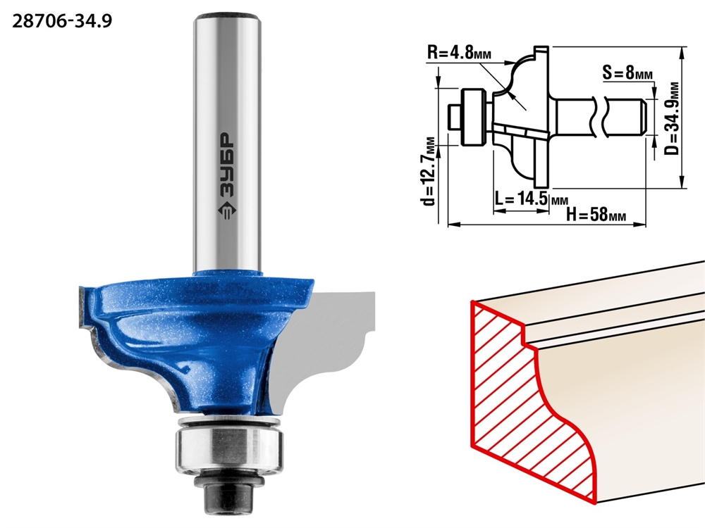 ЗУБР 34.9 x 15 мм, радиус 4.8 мм, фреза кромочная калевочная №5, Профессионал (28706-34.9)