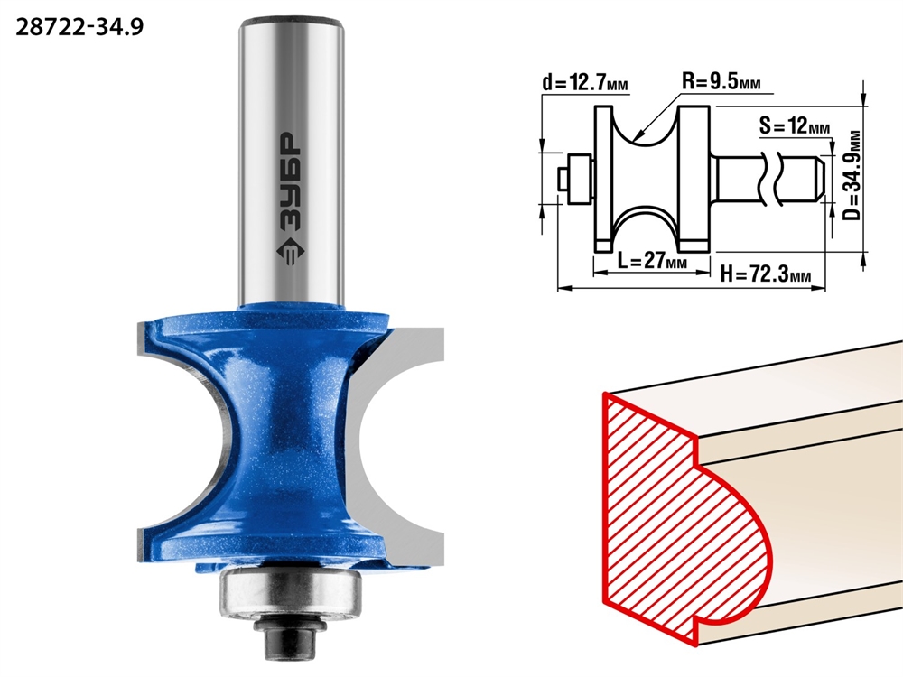 ЗУБР 34.9 x 29 мм, радиус 9.5 мм, фреза полустержневая с подшипником, Профессионал (28722-34.9)