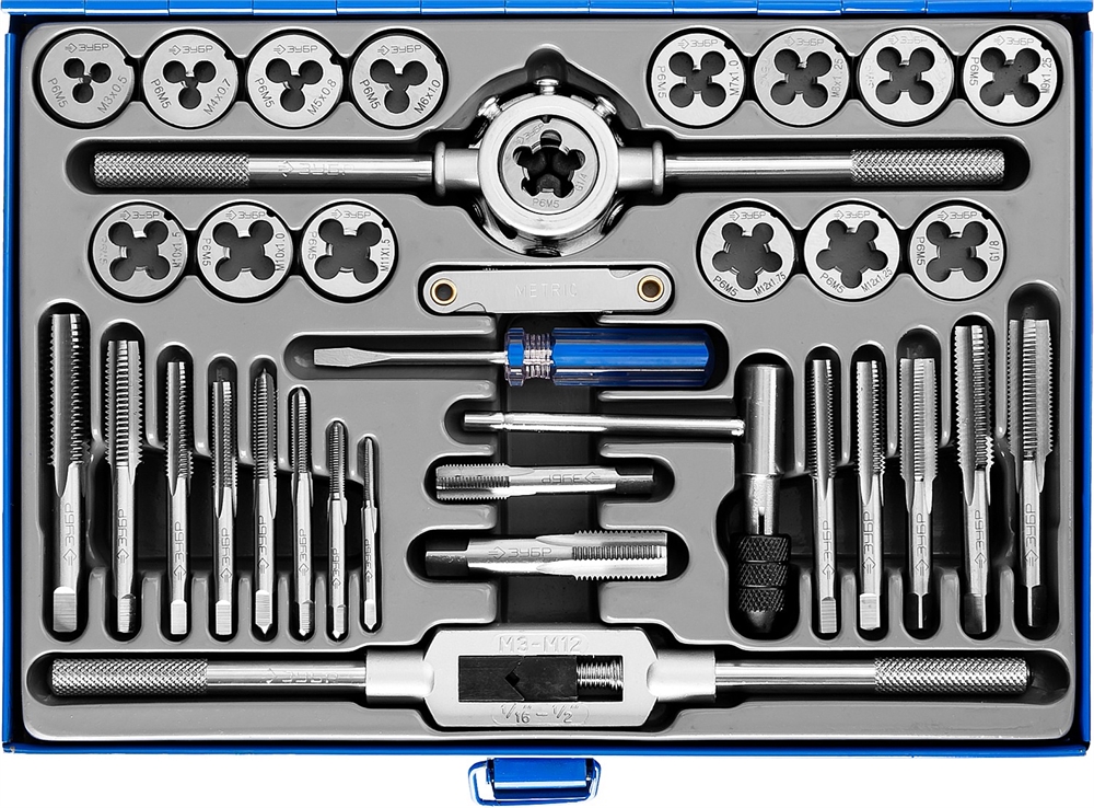 Набор предназначен для нарезания и калибрования внутренней и внешней метрической и трубной резьбы в сквозных и глухих отверстиях в сталях с пределом прочности до 900Н/мм2, цветных металлах, пластике.