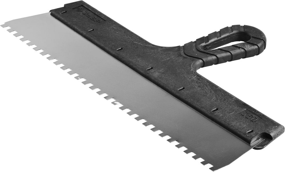 Благодаря зубчатой кромке шпатель идеально подходит для работы со строительными и клеевыми смесями, полотно из нержавеющей стали обеспечивает надежность и долгий срок службы инструмента, а удобная пластмассовая рукоятка создает условия для комфортной работы