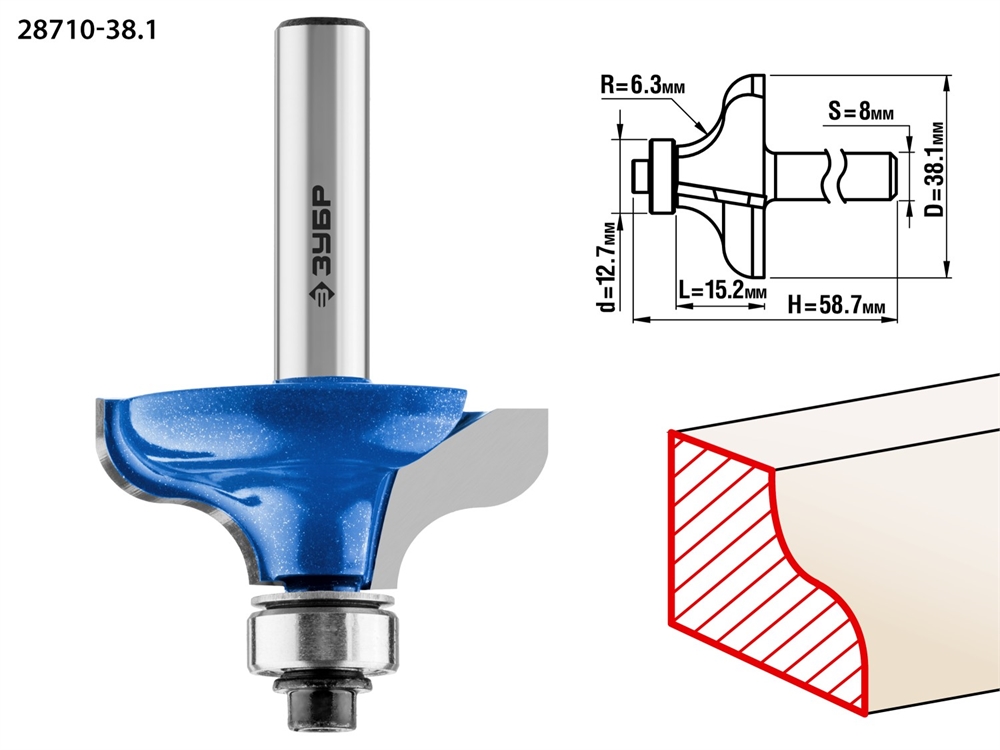 ЗУБР 38.1 x 15 мм, радиус 6.3 мм, фреза кромочная калевочная №8, Профессионал (28710-38.1)