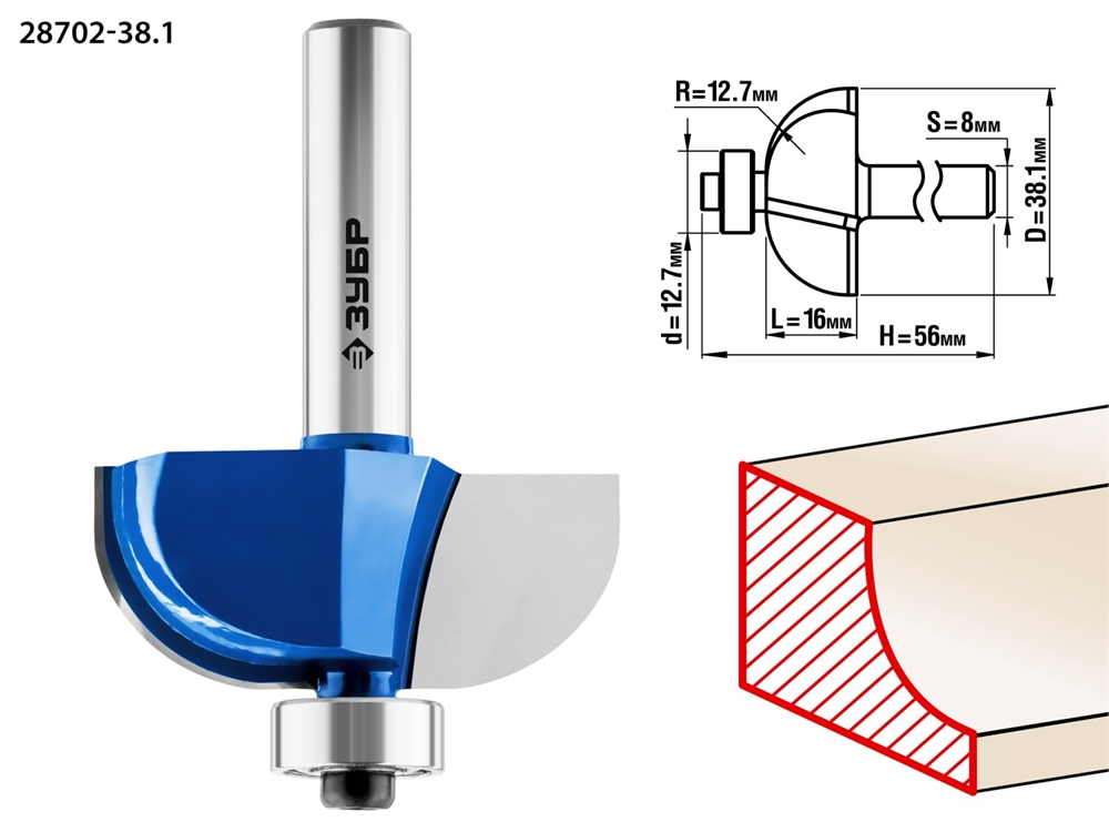 ЗУБР 38.1 x 16 мм, радиус 12.7 мм, фреза кромочная калевочная №2, Профессионал (28702-38.1)
