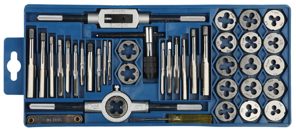 Набор предназначен для резьбонарезных работ в конструкциях и заготовках из сталей и цветных металлов. Метчики ручные однопроходные используются для нарезания внутренней метрической резьбы с нормальным и мелким шагом в глухих и сквозных отверстиях. Метчик трубный предназначен для нарезания внутренней трубной резьбы. Плашки предназначены для нарезания внешней метрической резьбы с нормальным и мелким шагом. Плашка трубная используется для нарезания трубной резьбы Метчикодержатель предназначен для надежного закрепления метчиков Плашкодержатель используется для закрепления плашек при проведении резьбонарезных работ Резьбомер предназначен для подбора необходимого шага метрической резьбы.