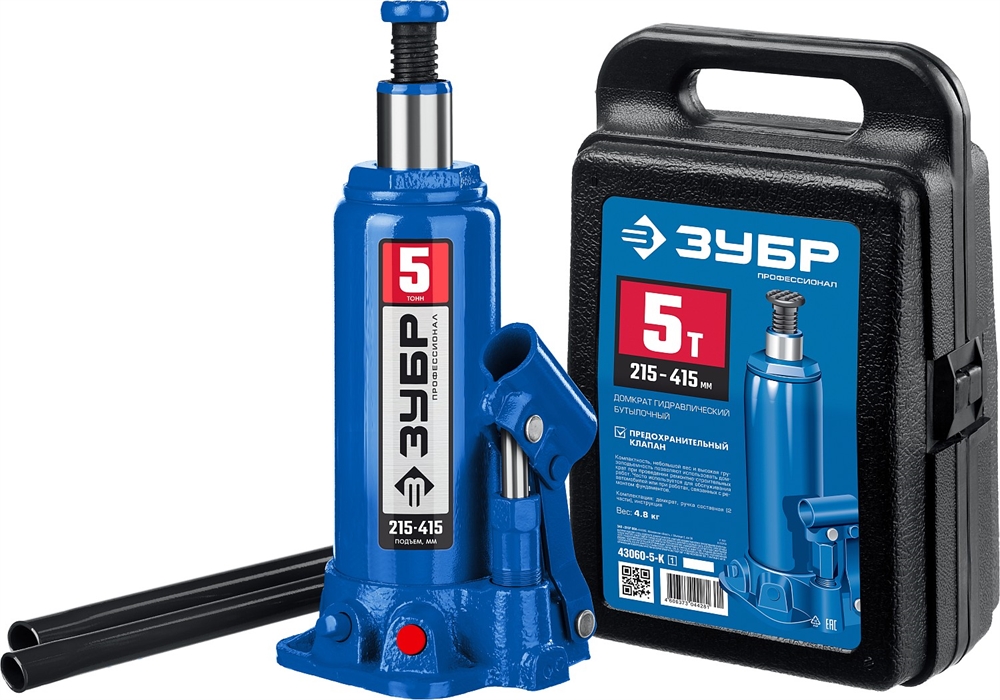 ЗУБР 5 т, 216 - 413 мм, бутылочный гидравлический домкрат в кейсе, Профессионал (43060-5-K) сертифицирован производителем ЗУБР, передача сертификатов осуществляется в момент отгрузки товара после обращения покупателя.