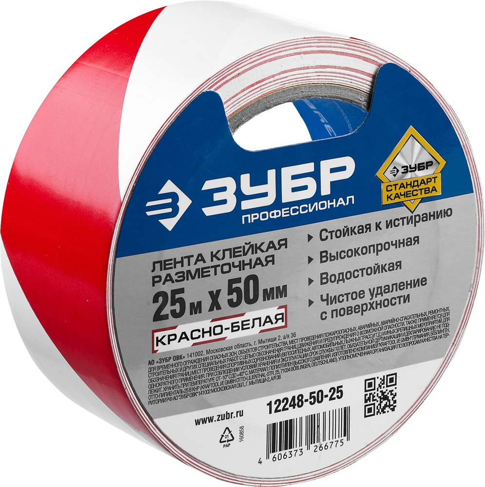 ЗУБР 50 мм, 25 м, красно-белая, разметочная клейкая лента, Профессионал (12248-50-25) сертифицирован производителем ЗУБР, передача сертификатов осуществляется в момент отгрузки товара после обращения покупателя.
